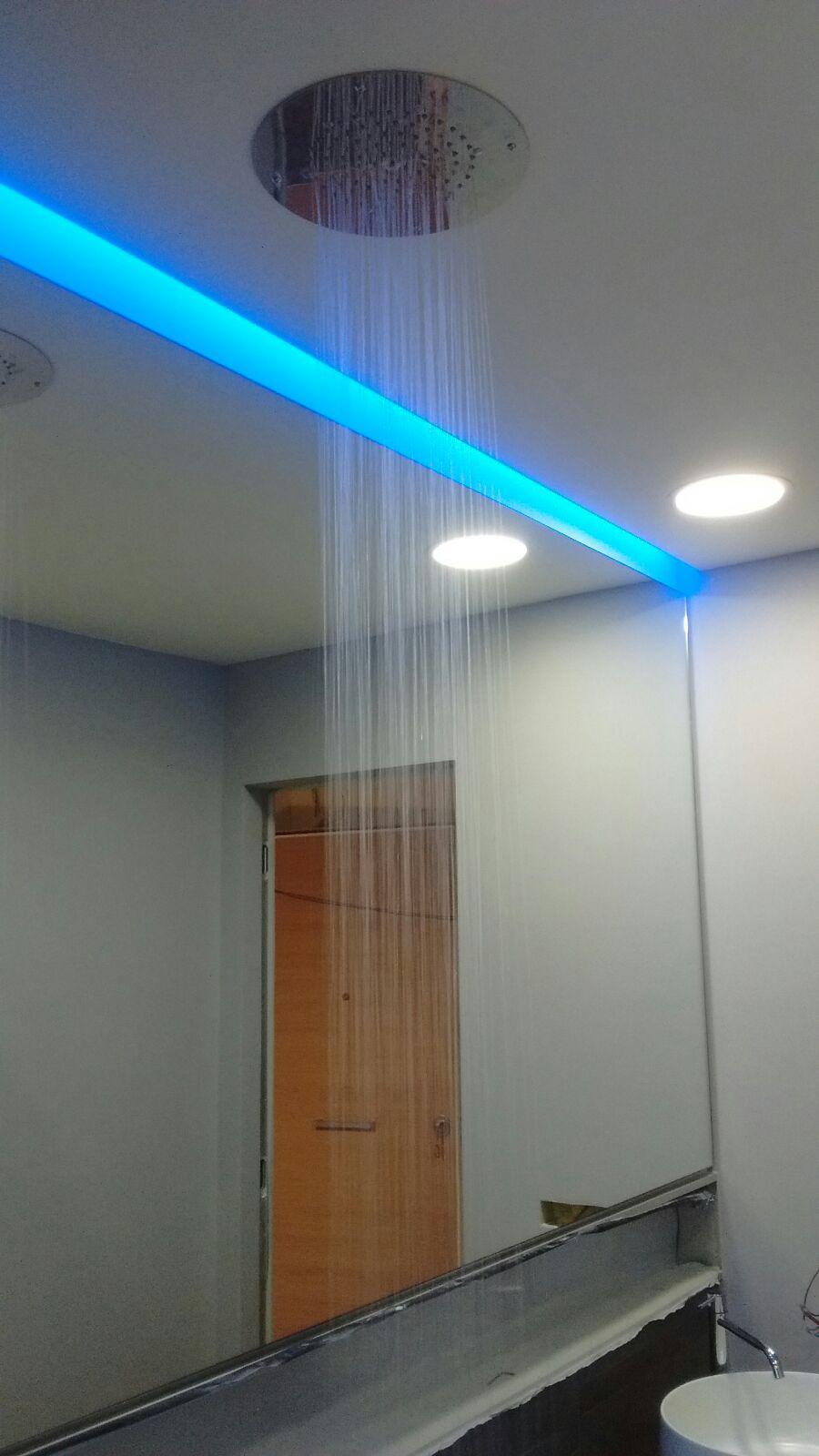 Fornitura: rubinetteria Gessi Via Tortona, soffione a soffitto Bossini, rivestimento grigio Docks Abk, mobile Compab