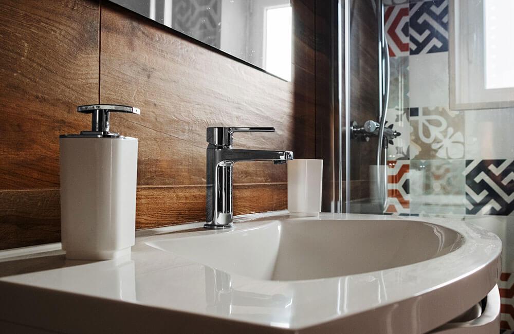La pietra, predominante in ogni ambiente, è stata messa in risalto accostando ad essa un gres effetto legno dalla colorazione calda, rivestendo con lo stesso l’intera scala interna e parte dell’ambiente bagno legato a sua volta con un rivestimento di cementine dal decoro variegato.