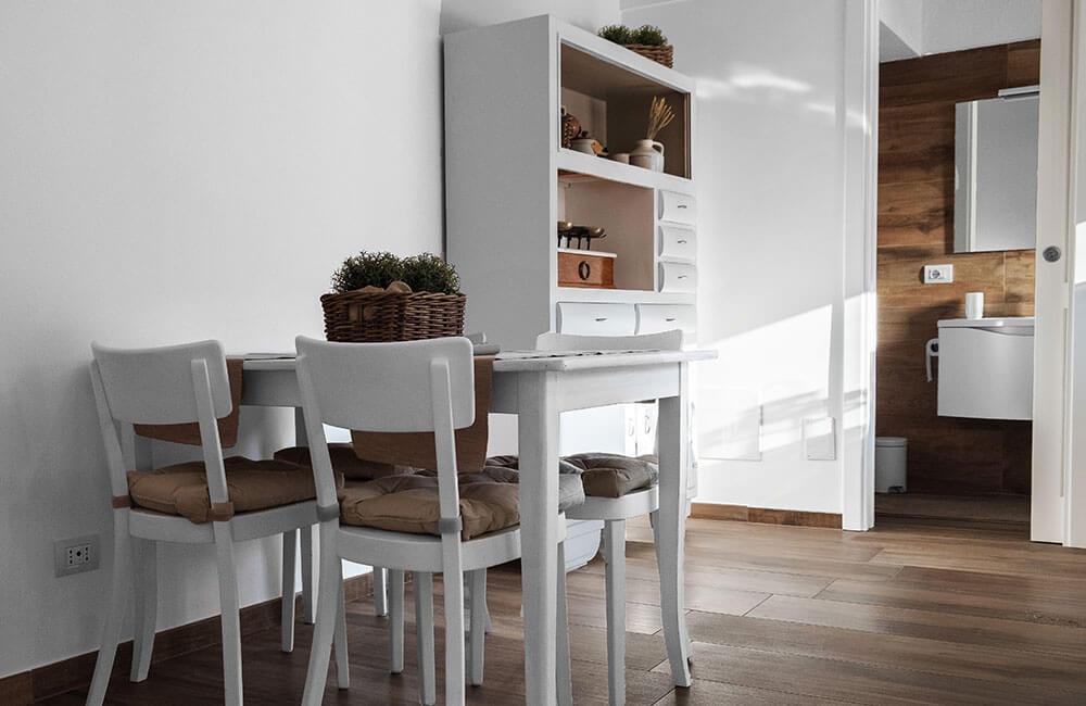 Il rivestimento dell’angolo cucina, diamantato e dallo smalto lucido, rievoca le cucine di un tempo, la cui peculiarità viene enfatizzata ulteriormente dal bianco degli stucchi.
