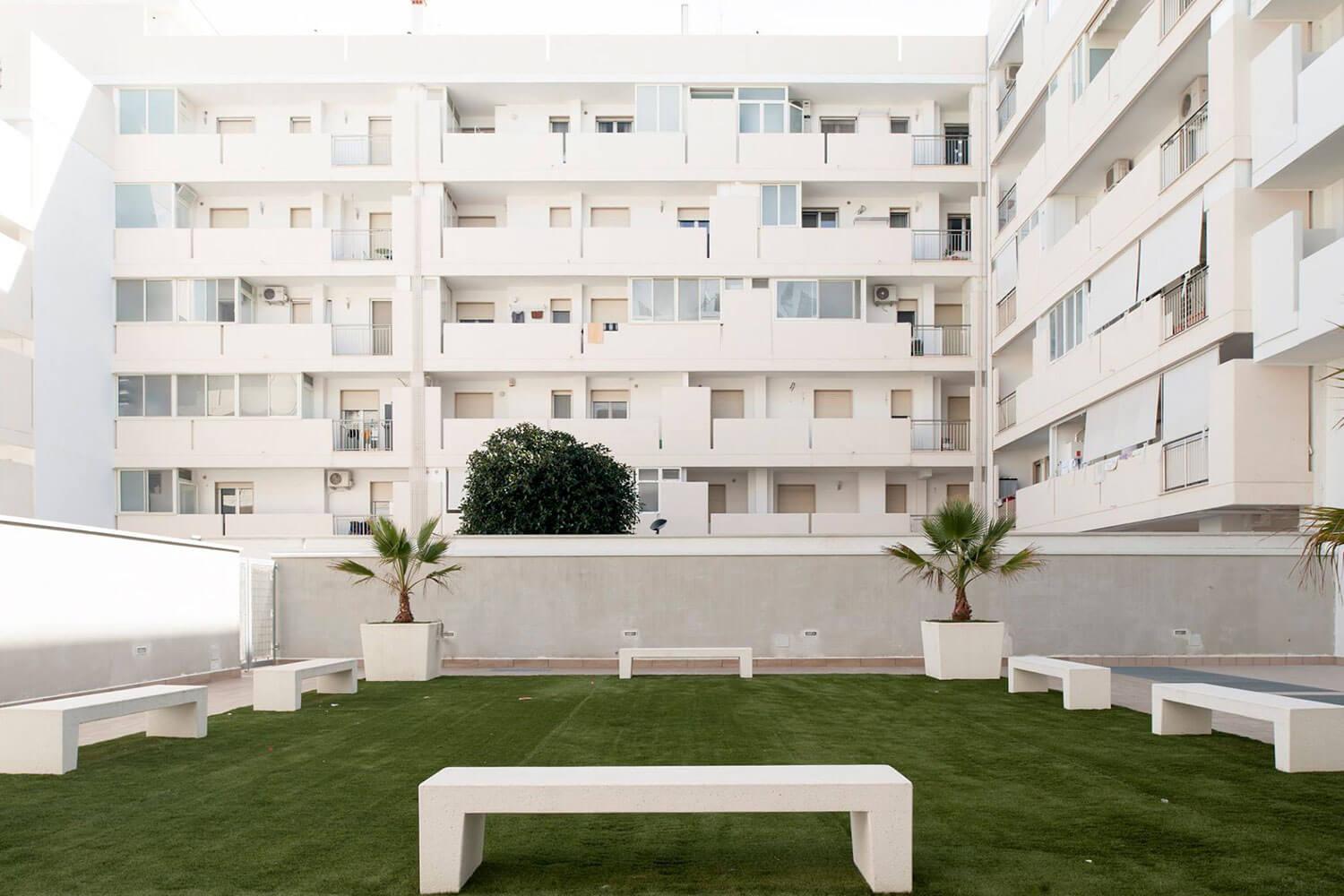 Nello specifico il piano terra a doppia altezza è destinato ad attività commerciali con prospicienti due viali pedonale, con attrezzature urbane a verde e panche e ampi parcheggi pubblici di piano oltretutto con un parco in corte. Volumi, aggetti, grandi vetrate e balconi terrazzati, con una forte presenza di verde, consentono di vivere la privacy della villa in appartamento.